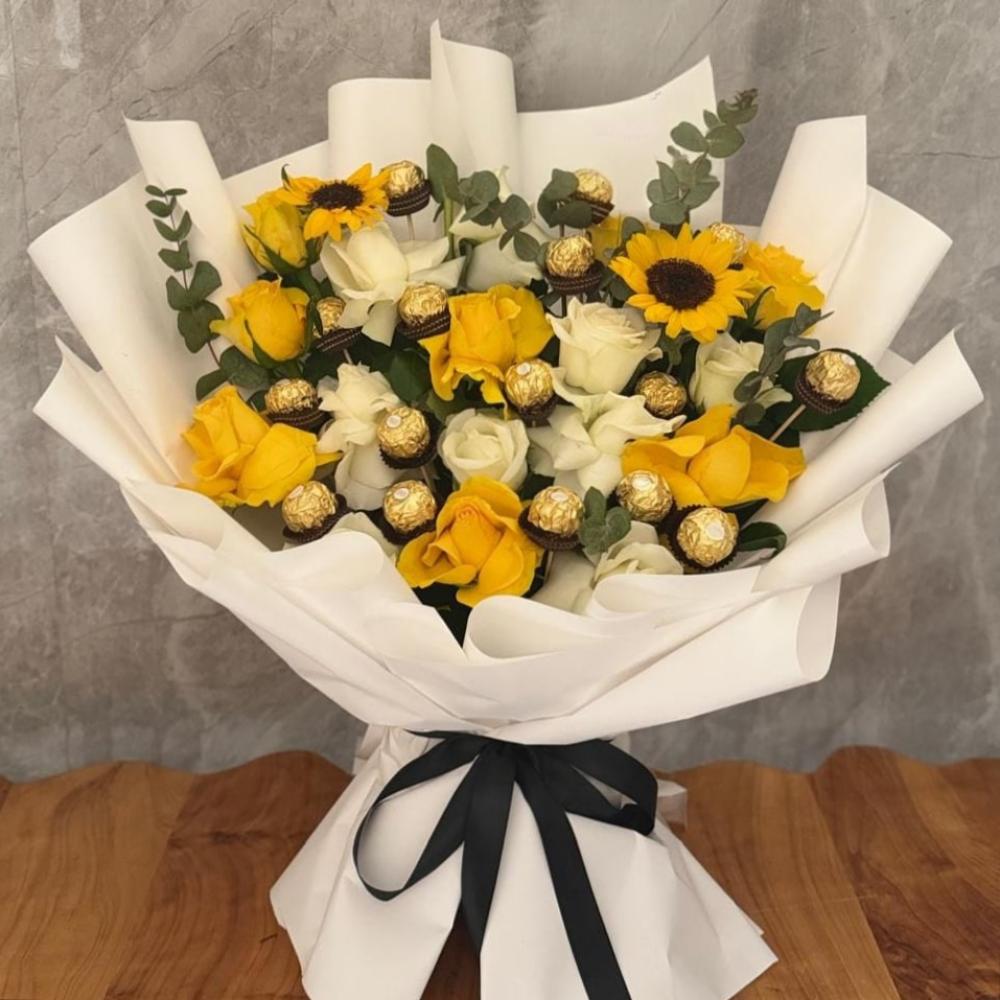 عبّر عن دفء مشاعرك وأناقة ذوقك مع باقة أشعة الشمس، تنسيق فاخر يجمع بين ورود الجوري البيضاء والصفراء مع لمسة مشرقة من دوار الشمس الفاتن، مزينة بقطع شوكولاتة فيريرو روشيه الفاخرة وأوراق الكلبتس الخضراء الطبيعية، مغلفة بورق أبيض أنيق ومربوطة بشريطة سوداء تضيف فخامة وجاذبية.